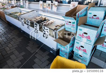 道の駅ゆのたに 物産館 深雪の里 屋内のお土産屋 柿の種 夏晴れの青空 新潟県魚沼市吉田