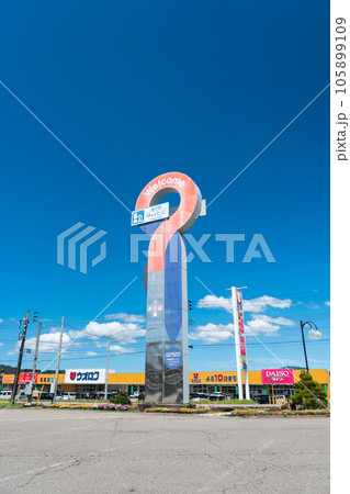 道の駅ゆのたに 物産館 深雪の里 巨大な看板を見上げる 夏晴れの青空 新潟県魚沼市吉田
