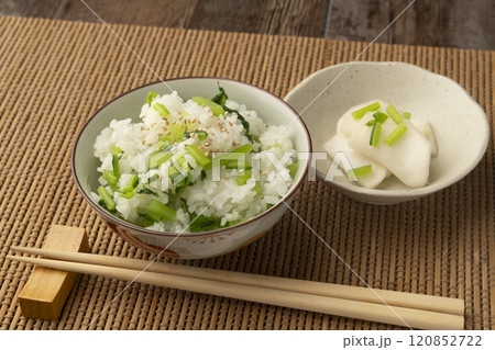 菜飯 土鍋で炊いた白米に塩茹でした蕪の葉を混ぜる