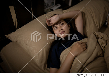 Young asian woman cannot sleep insomnia late at night. Can't sleep. Sleep apnea or stress. Sleep disorder concept.
