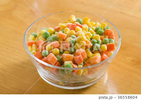 お皿に入った冷凍のミックスベジタブル