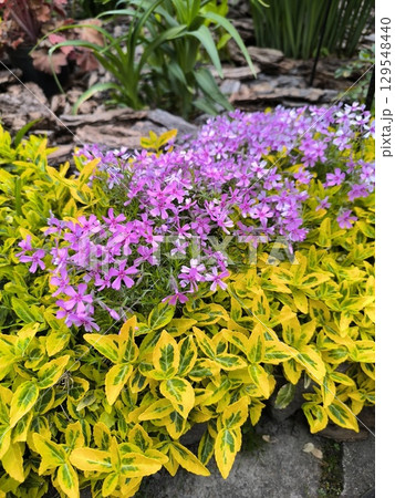 Ornamental plants in the garden, birchbark and phlox with young leaves and flowers