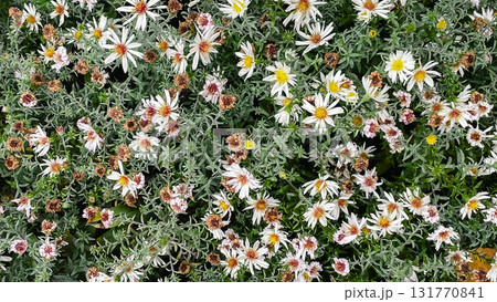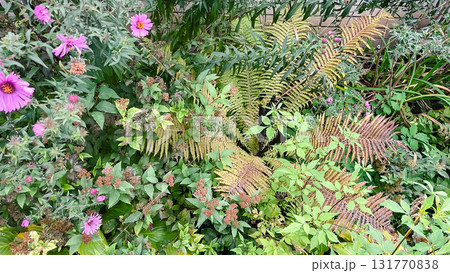 Cottagecore fall garden texture. Asters and fading ferns in natural, sustainable border