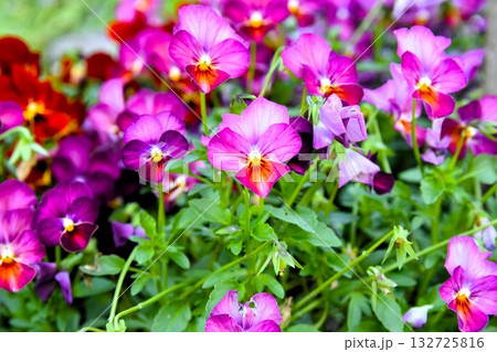 美しいビオラの花が咲き誇る春の花壇