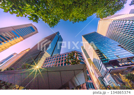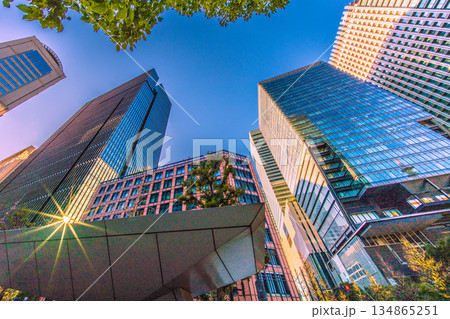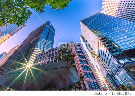 日本の東京都市景観赤信号と輝き…珍景。奇跡の反射光…年末の大手町。冬晴れ…明暗分けるビジネス界