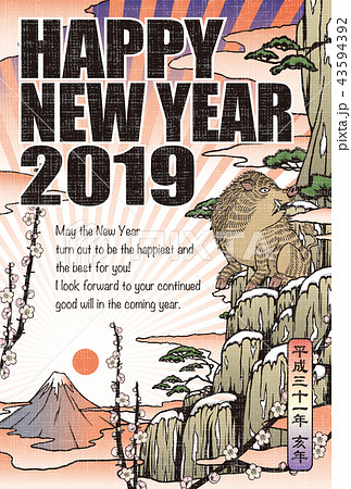 2019年賀状「かわいいイノシシ」ハッピーニューイヤー 日本語添え書き付き