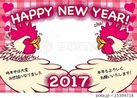 2017年賀状テンプレ「ニワトリkissフォトフレーム」 英語賀詞 添え書き入り ハガキ縦