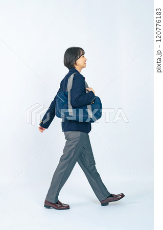 歩くジェンダーレス制服を着た女子学生の全身写真