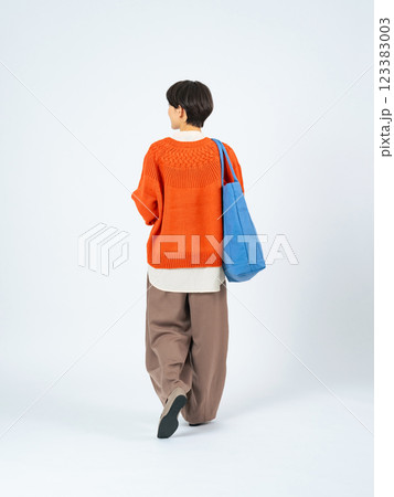 カジュアルウェアを着て歩く女性の後ろ姿の全身写真