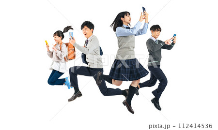 スマホを使いながらジャンプする学生のグループ 手作業で精密に切り抜いた背景透過全身写真PNG