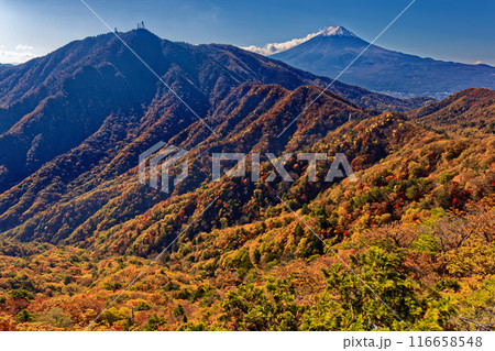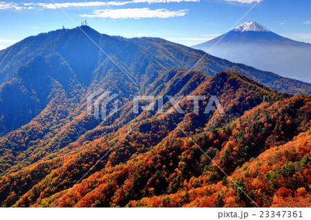 紅葉の本社ヶ丸稜線から見る富士山と三ツ峠