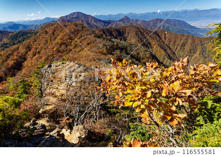 紅葉の本社ヶ丸から見る南アルプスと甲府盆地の町並み