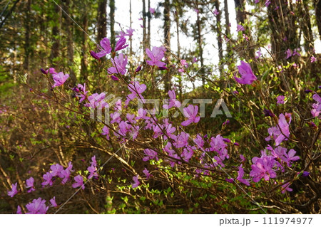 木漏れ日を背景に森の中に咲くミツバツツジの花 Ver1