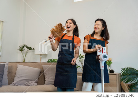 Joyful Housekeeper with Feather Duster Enjoyable Cleaning and Household Chores Concept