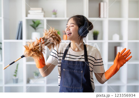 Joyful Cleaner Enjoying Work Vibrant Home Cleaning Concept with Duster and Music