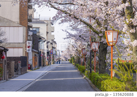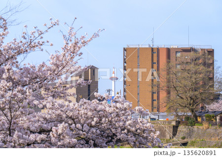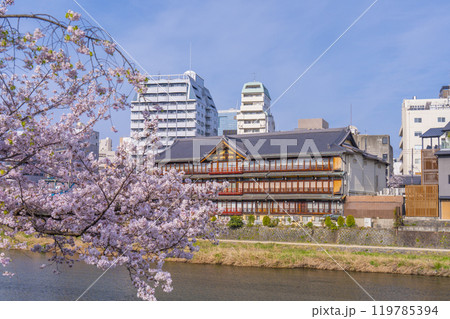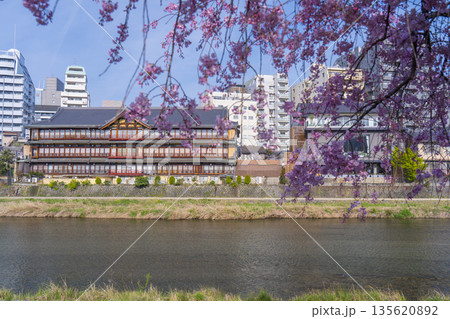 五条大橋から四条方面に見た京都鴨川の風景 桜の季節