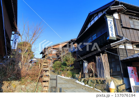 馬籠宿石畳の坂道を見る町並み