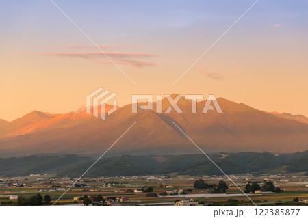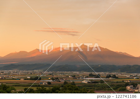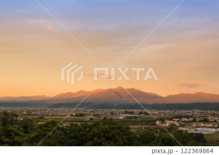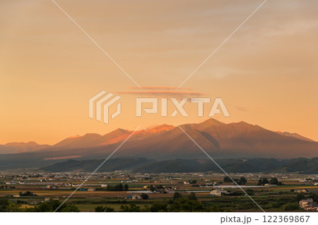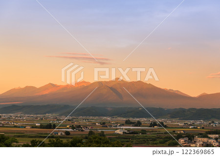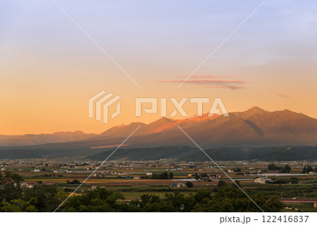 【ふらのワインハウスからの秋の夕日と十勝岳連峰】
