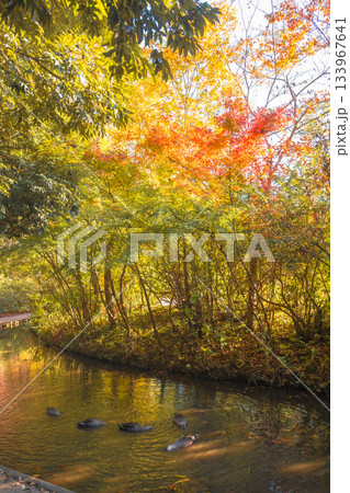 紅葉した木々とカモが泳ぐ風景 千葉県野田市 清水公園