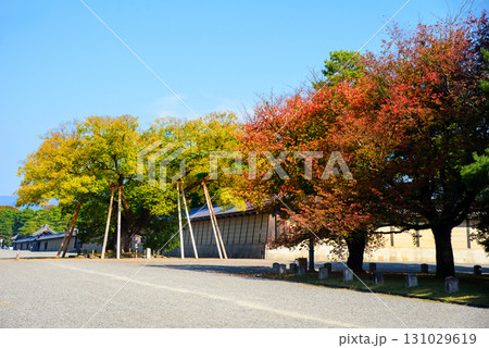 秋晴れの誰もいない京都御所南西角の椋の大木が見事