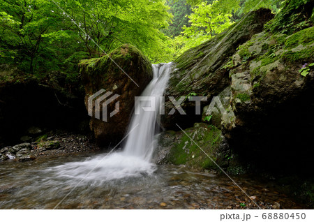 爽やかな春の季節に新緑が眩しい滝のある風景