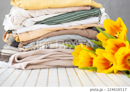 mockup, stack of clean clothes on table with tulip flowers. dry cleaning. Housecleaning, housewife
