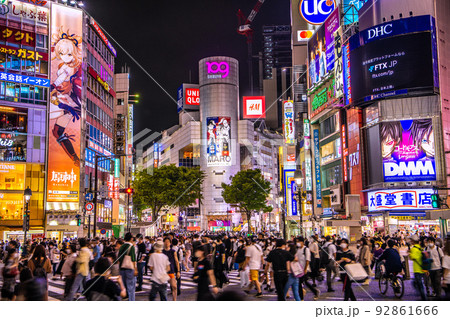 日本の東京都市景観 インバウンド復活…夜でも賑わう渋谷スクランブル交差点=11日、19時53分