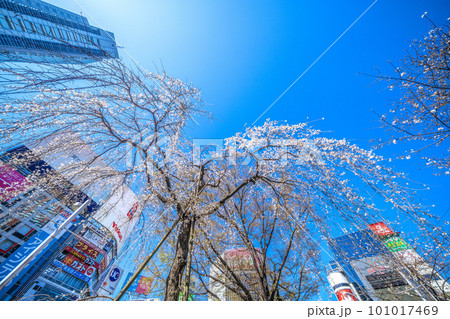 日本の東京都市景観 青空に映えるしだれ桜(ハチ公生誕)と渋谷駅前の渋谷Qフロントなど=3月19日