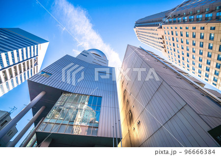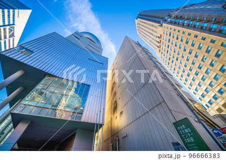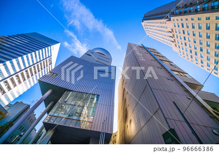 日本の東京都市景観 渋谷区文化総合センター大和田。ガラス窓に桜丘口再開発のビルなどが映る