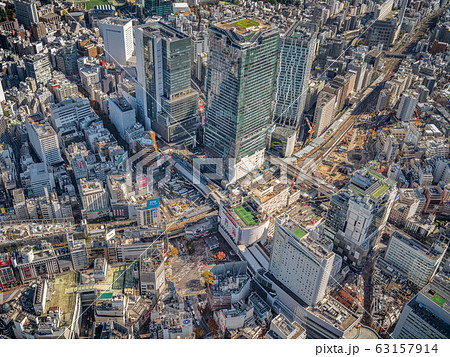 日本の東京都市景観 渋谷駅前再開発と超高層ビル群(右手前は再開発中の桜丘口地区)