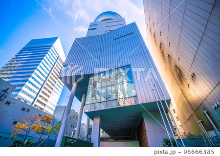 日本の東京都市景観 渋谷区文化総合センター大和田。ガラス窓に桜丘口再開発のビルなどが映る