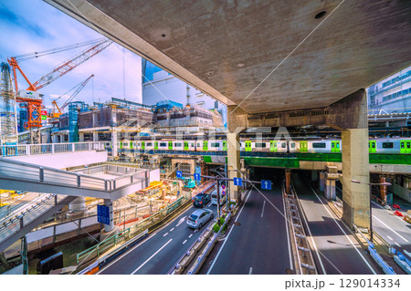 日本の東京都市景観7月27日。猛烈な暑さ…山手線の電車や駅前のクレーンなどの巨大重機(左側)