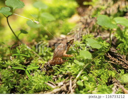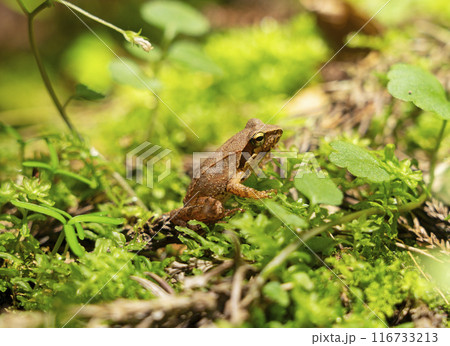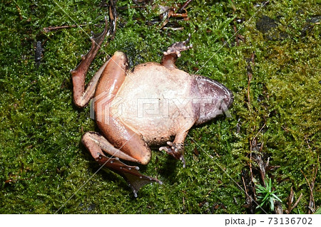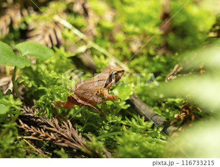 タゴガエル 日本固有種 若いカエルが苔むした地面にいる。