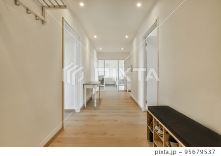 Interior of narrow corridor with telephone and wall hanger in daylight