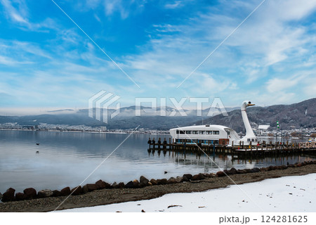 諏訪湖 石彫公園から見た諏訪湖と初島神社の冬景色