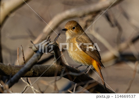 屋外の藪の細い枝の先にとまる小さな小鳥、ジョウビタキの雌