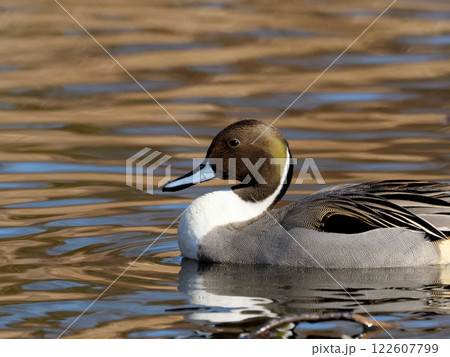 夕日に照らされた水面で毛繕いするオナガガモ(オス)
