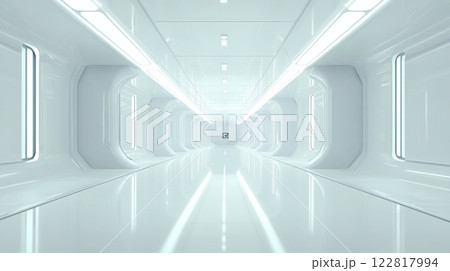 Long bright corridor in scientific laboratory building. Clean white hallway. Generative AI