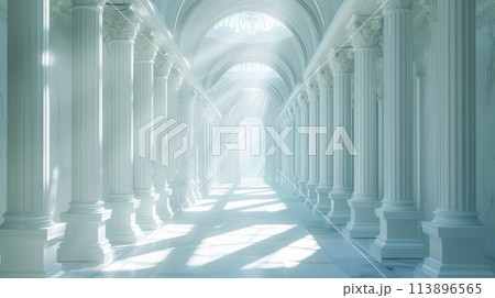 Columns and ceiling made of stone and tiles. Beautiful place with colonnade filled with bright sunlight. Building with colonnade. Old temple or palace