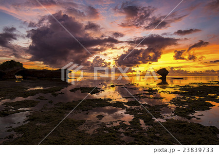 沖縄 水鏡の映る夕日ときのこ岩(渡具知ビーチ)