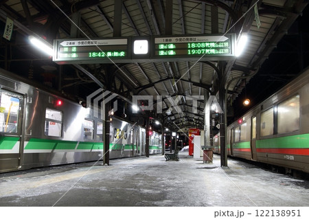 冬の小樽駅に停車中の函館本線H100形・731系電車