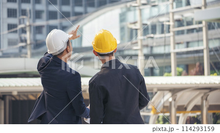 Civil Construction engineer teams shaking hands together wear work helmets worker on construction site. Foreman industry project working engineer teamwork. Two asian engineer team shake hands together
