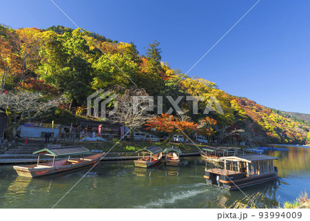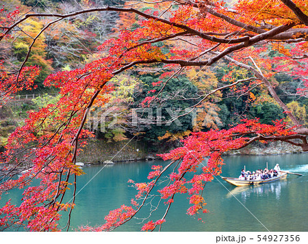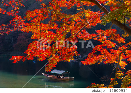 紅葉と静かな流れの桂川での舟遊びイメージ|渡月橋エリア|京都府京都市嵐山
