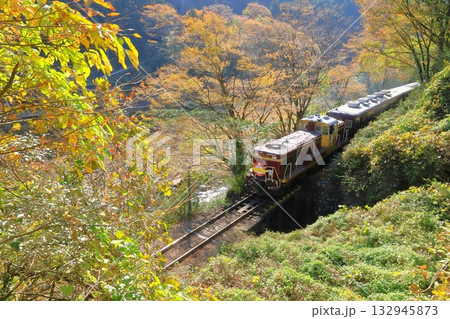 わたらせ渓谷鐵道「山間部のカーブを走る列車」黄葉した木々背景に