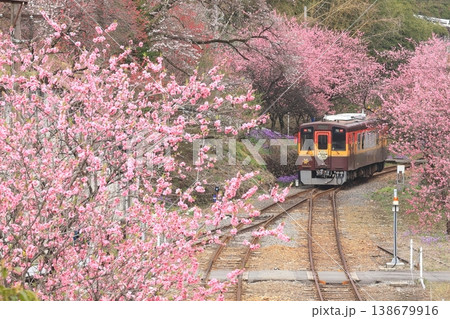わたらせ渓谷鐵道「桜の花咲く上神梅駅と列車」