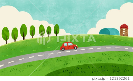 草原とサイロの風景 ドライブする赤い車 水彩風手描きイラスト