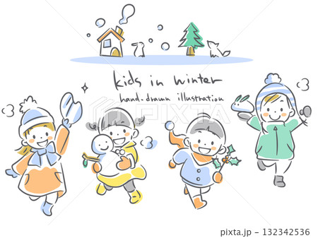 冬を楽しむ子供たち やわらかくて暖かみのある水彩風手描き線画イラスト