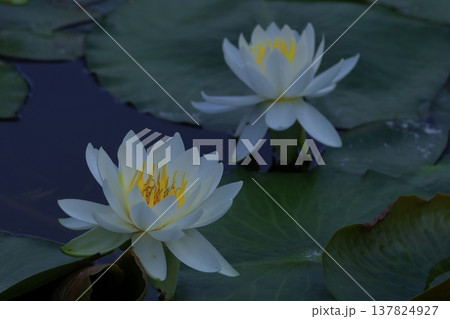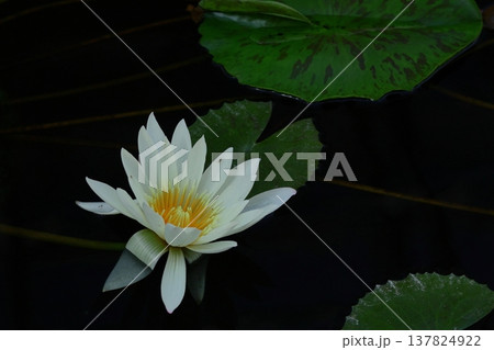 Tranquil water lily with petals and dew, Elegant white water lily gracefully lies on pads with dew under soft morning light