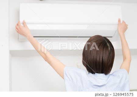 エアコンを操作する若い女性 ライフスタイルイメージ