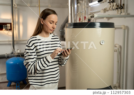 Young Woman Troubleshooting Broken Boiler in Home Basement During Winter Season
